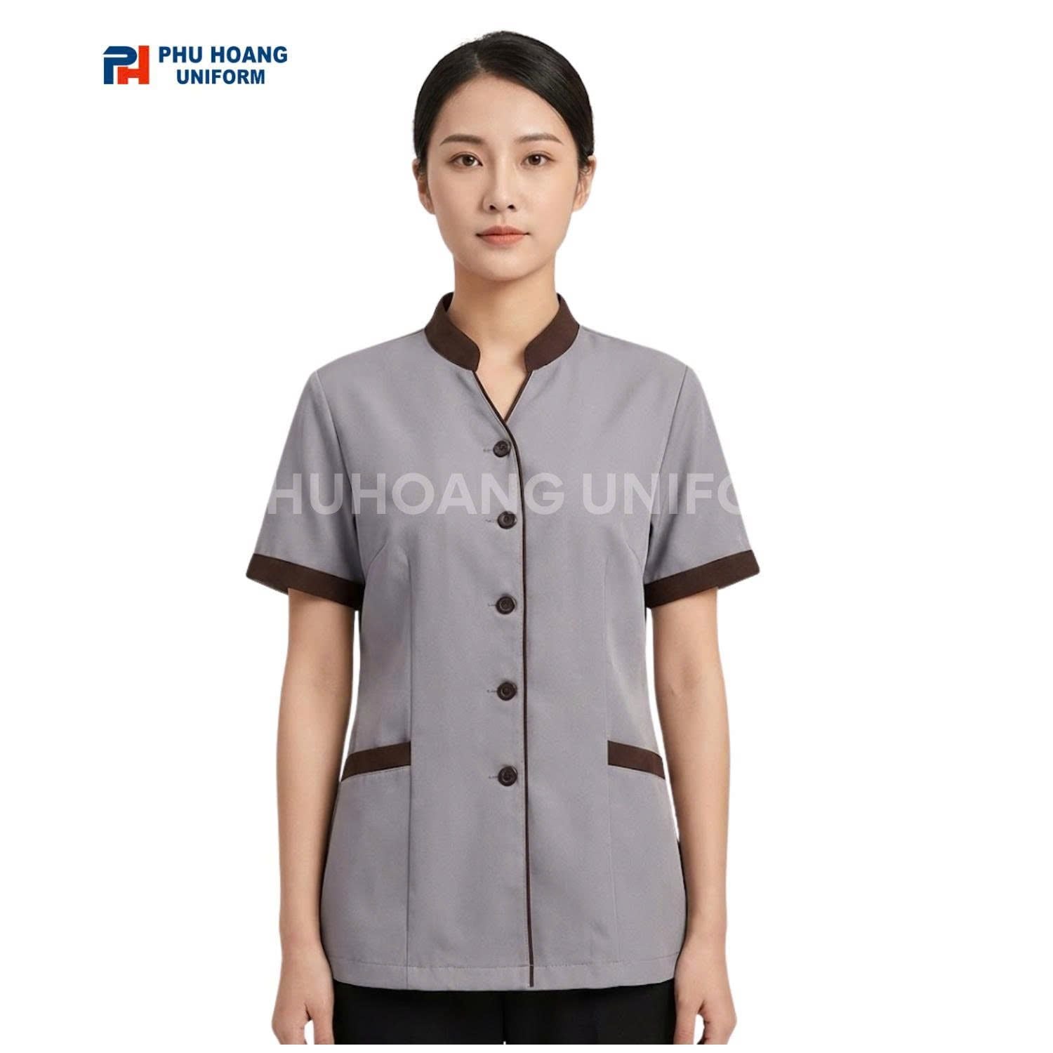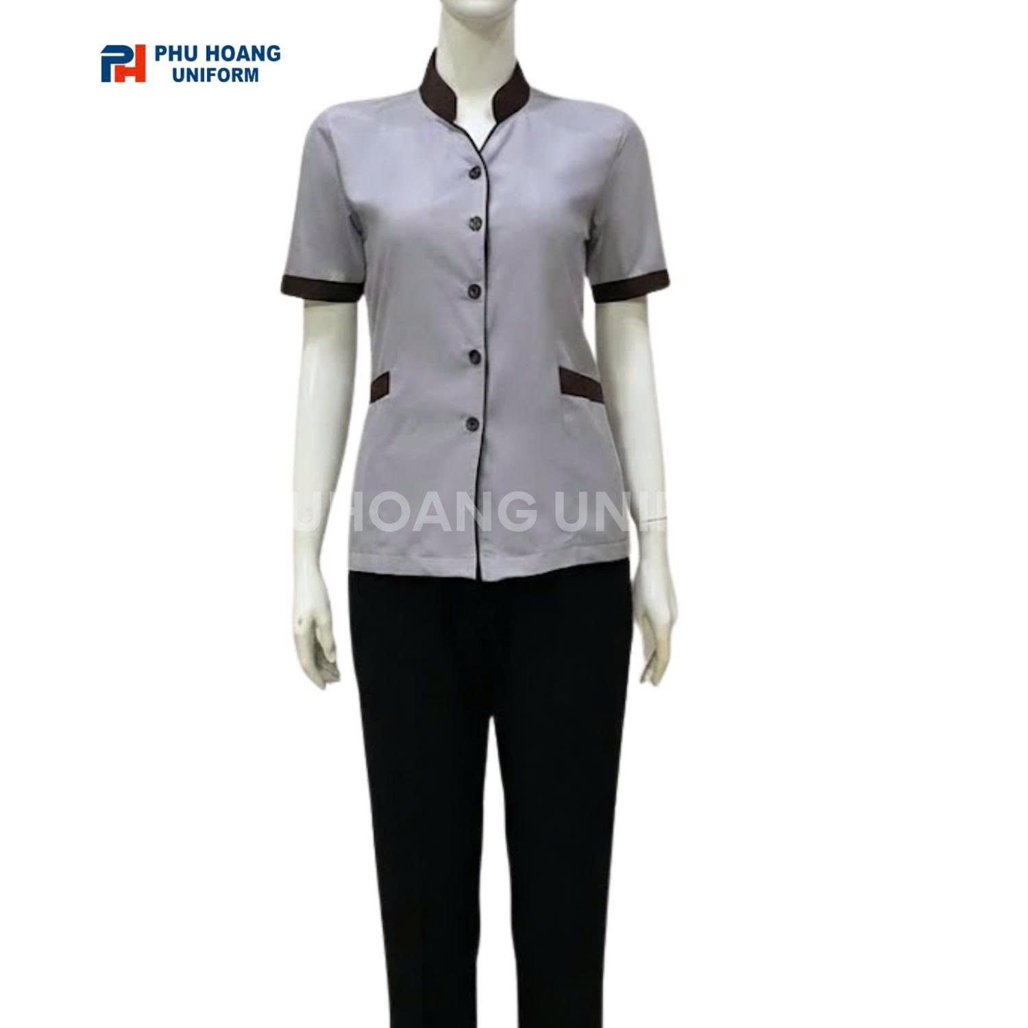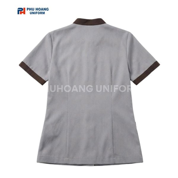 📍 Một bộ đồng phục đẹp giúp khách hàng nhận diện thương hiệu nhanh hơn và tạo ấn tượng tốt ngay từ lần tiếp xúc đầu tiên. Áo tạp vụ xám viền nâu với thiết kế chỉn chu góp phần nâng cao hình ảnh chuyên nghiệp cho doanh nghiệp.